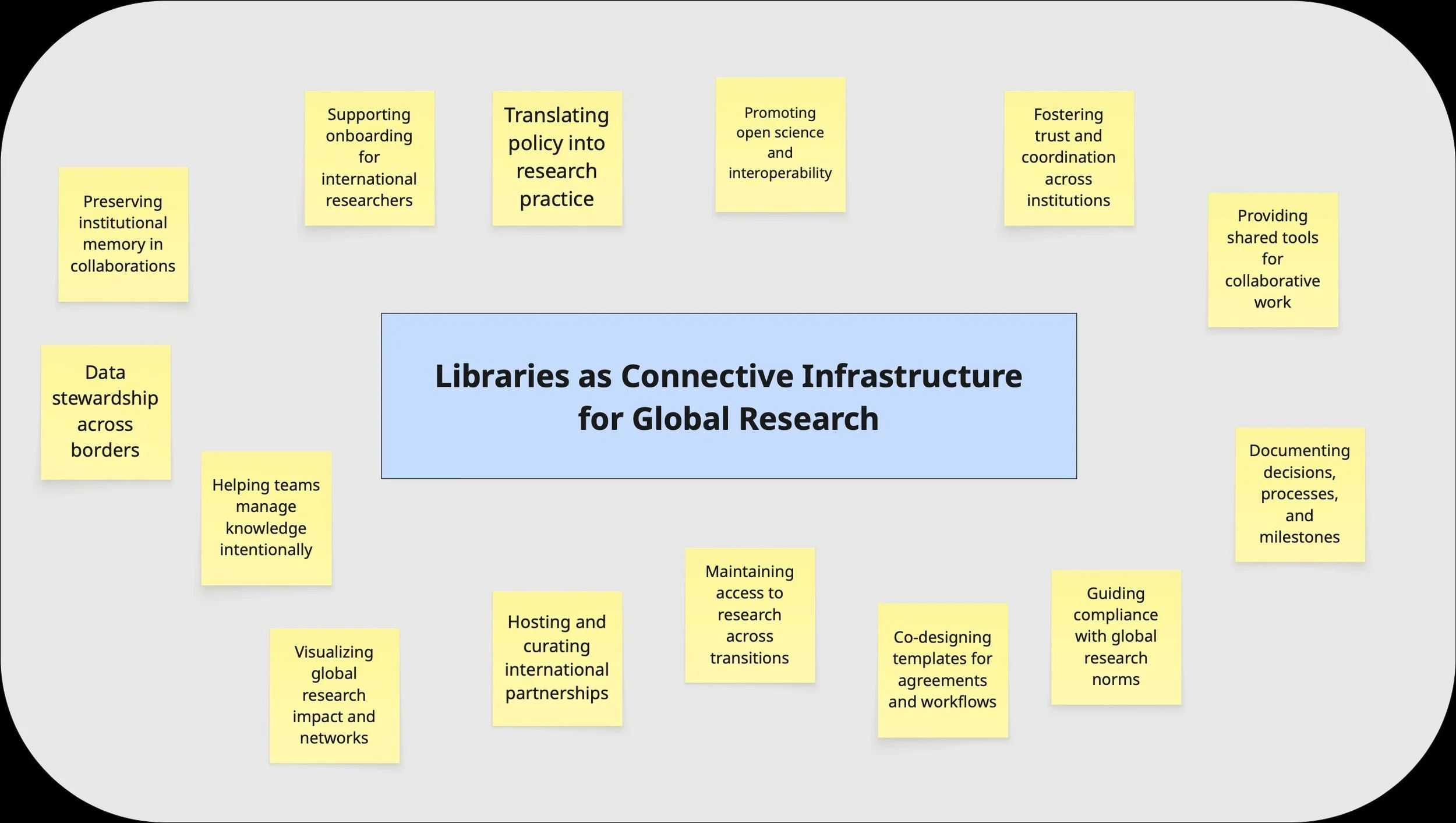 Libraries already provide many of the tools and services that international research partnerships rely on. These include data stewardship, policy guidance, publishing support, curated collections, repositories, analytical tools, and metrics expertise. While essential, these contributions are often fragmented across units or treated as secondary to the research itself. What would it mean to approach this work not only in service of our individual institutions, but in support of the success of the global research enterprise?
