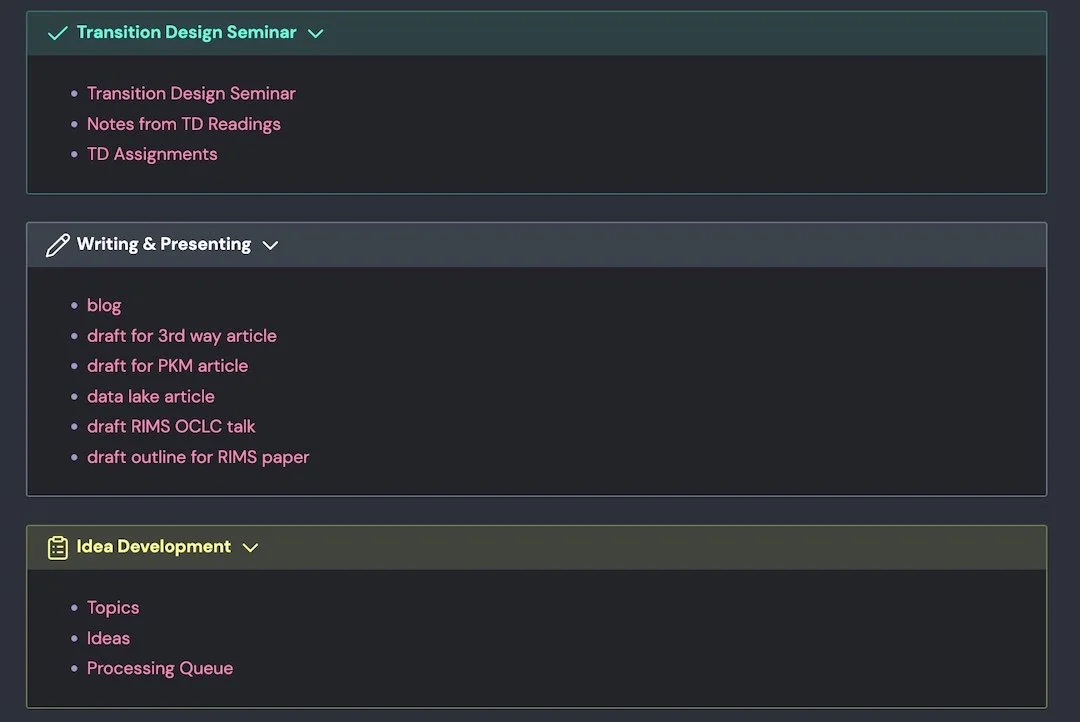 I'll share more about how I use Obsidian in other ways later this semester. Here is glimpse at the rest of my Spring home page which includes different types of journaling practices, a section for writing papers and presentations, an area for a seminar course that I'm taking, and a section for idea development & idea management.