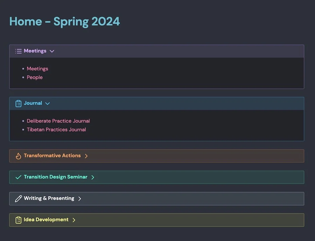 Each semester, I create a custom homepage for my personal knowledge management system. Think of it as an interface or menu that aligns with my projects, priorities, and intentions for the coming months. It serves as a daily launching pad, allowing me to navigate my notes, obligations, and ideas quickly and seamlessly. Here's my Spring 2024 homepage: