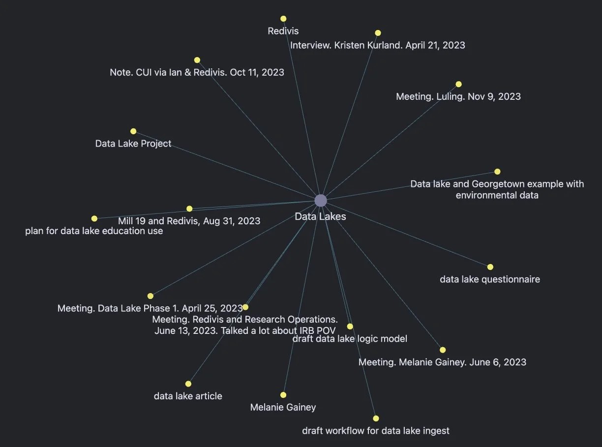 When I look at a topic like “data lakes” I can see the various of meetings, projects, and other information connected across my wide collection of notes.
